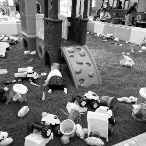 该游乐场位于未央路熙地港购物中心3楼,一进游乐场,能明显闻到一股异味,其中积木区与沙池的中间隔一块空地,地板上比较脏,沙池内有几个包装袋没有及时清理。进园换鞋处的泡沫板上有污渍,角落摆放的垃圾桶周围很乱,有废纸没有入筐。捞鱼池边上有很多污渍,池内有好几条死鱼漂在水面上。池子后面还堆砌几摞箱子、拖把等杂物。旁边画画的桌子上、椅子上洒有各种颜料,颜料瓶摆放凌乱。墙角是洗手池,台面和柜子都很脏,有很多黑点。