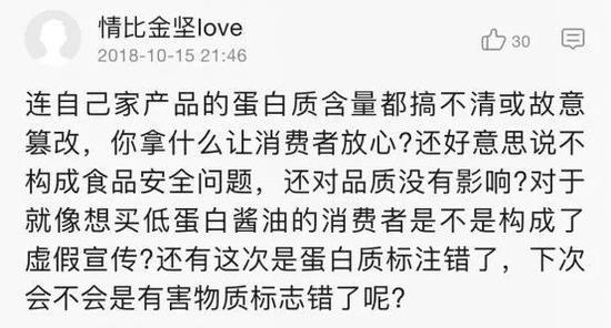 公告中称,按照公式可计算出该瓶生抽蛋白质NRV%=0.9(实测蛋白质含量)÷60(NRV参考值)×100%=1.5%。而公司在该瓶生抽标签中把蛋白质NRV%仅标识为1%,因为标示值低于了计算值,所以被点名了。