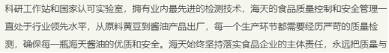 其中强调,“从原料黄豆到酱油产品出厂,每一个生产环节都需要经历严苛的质量检测,确保每一瓶海天酱油的优质和安全”。