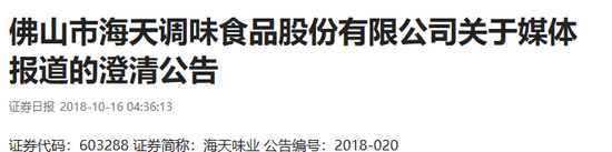 公告中称,2018年10月13日起 ,媒体上出现了标题为《打酱油的注意了!江苏消保委发布试验报告 海天、***等被点名》新闻报道,报道内容涉及海天产品内容为:2017年1月份生产的一瓶海天500ml生抽酱油营养成分表中蛋白质NRV%计算有误,标识与实际检测结果不符合。