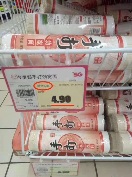 在随后对南京某大型连锁超市的回访发现,此前报道中的今麦郎“手打面”系列,也突击降价中。超市货架展示的900克“今麦郎手打劲宽面”标价签显示,此款面条价格已从8.20元降至4.90元。
