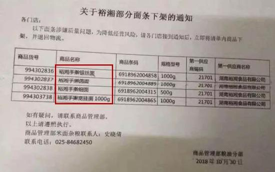记者发现,《下架通知》中明确含“裕湘手擀银丝挂面”在内的四种裕湘食品公司生产的面条,均在此次下架之列。