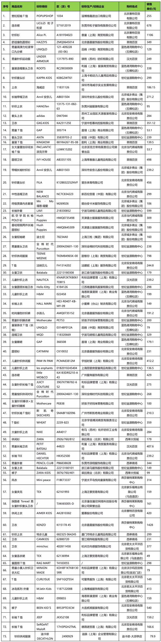 本次比较试验的样品是由北京市消协的工作人员以普通消费者的身份从实体店铺随机购买了80款儿童服装商品68个品牌。购买价格从49元至1428元不等。