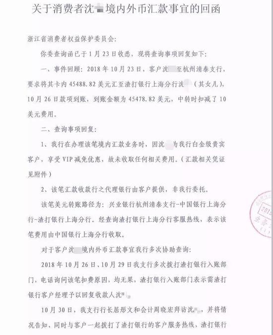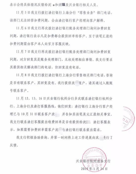 兴业银行杭州清泰支行接到查询函后,于2019年1月24日给予了正式的书面回复。兴业银行首先表示,他们在沈先生的汇款业务中没有收取任何费用;同时,他们也协助沈先生向渣打银行上海分行客服热线进行了查询,对方表示,该笔美元转账路径为:兴业银行杭州清泰支行——中国银行上海分行——渣打银行上海分行,该笔费用是由代理行中国银行上海分行收取。