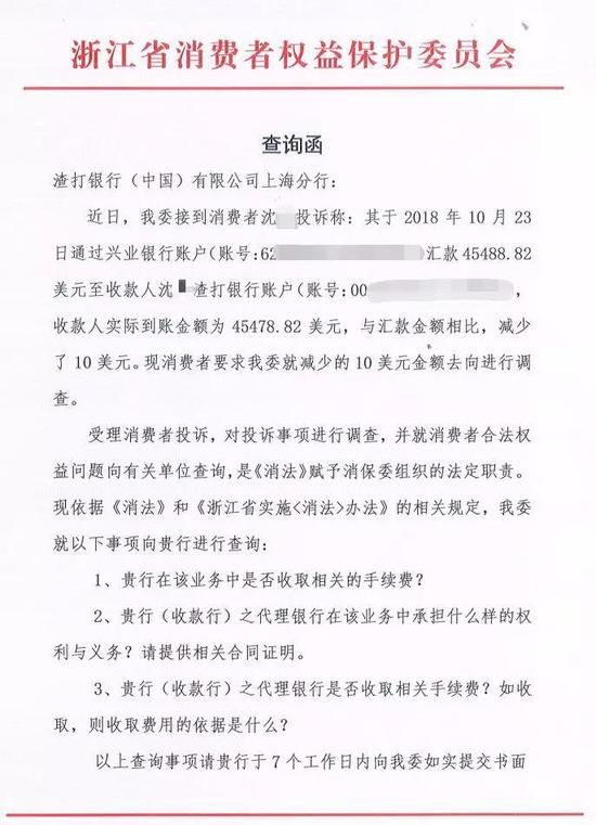 接到沈先生反映的情况,浙江省消保委高度重视,于2019年1月15日分别向兴业银行杭州清泰支行和渣打银行上海分行发出查询函,向两家银行了解相关情况。