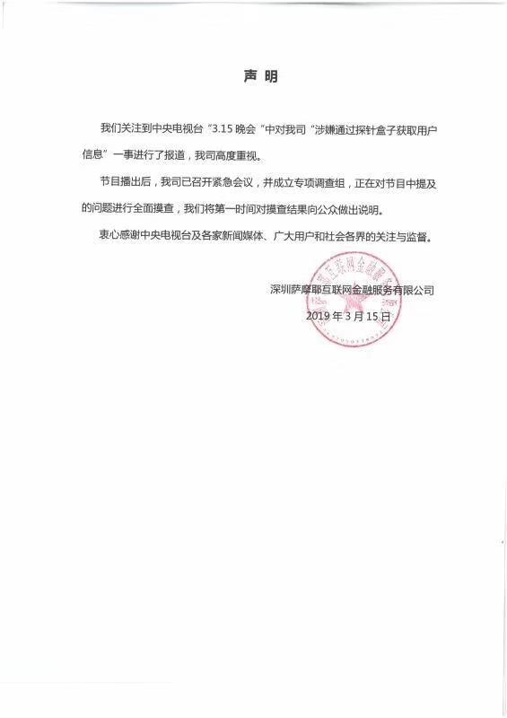 晚间,深圳萨摩耶互联网金融服务有限公司回应称,该公司已召开紧急会议,并成立专项调查组,正在对节目中提及的问题进行全面摸查。