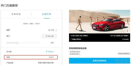 券商中国记者查询奔驰金融官网发现,类似事件中涉及的车辆——红色奔驰CLS300动感四门轿跑车售价约63.38万元,提供两种首付限时贷款方案:(1)首付三成19万元,月付款19264元,期限2年,年利率仅3.99%;(2)首付两成12.68万元,月付款期限36个月,月付15194元,年利率为4.99%。