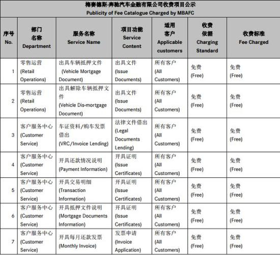 该文件显示,奔驰金融提供出具车辆抵押文件、出具解除车辆抵押文件、车证资料/购车发票、开具还款情况说明、开具交易明细、开具抵押文件说明,开具每月还款发票等服务,使用所有客户,但收费标准为免费,收取费用的部分仅包括提前还清贷款或者违约逾期等费用。