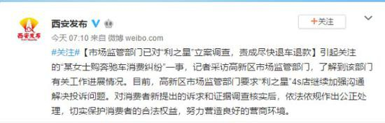 4月14日上午7时,西安互联网信息办公室官方微博“西安发布”称,市场监管部门已经对“利之星”4S店涉嫌质量问题立案调查,责成尽快退车退款。