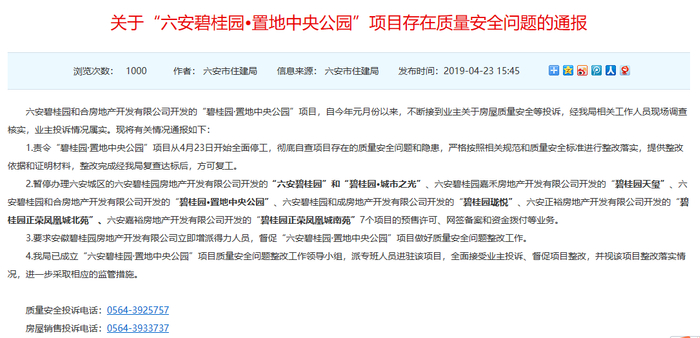 据安徽省六安市住房和城乡建设局消息,六安碧桂园和合房地产开发有限公司开发的“碧桂园·置地中央公园”项目,自今年元月份以来,不断接到业主关于房屋质量安全等投诉,经我局相关工作人员现场调查核实,业主投诉情况属实。