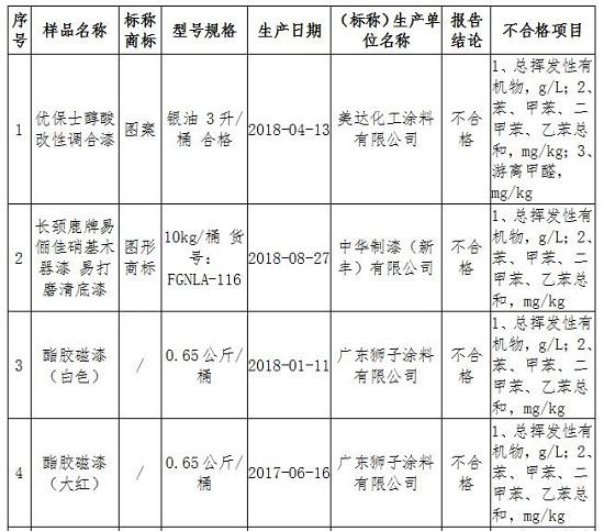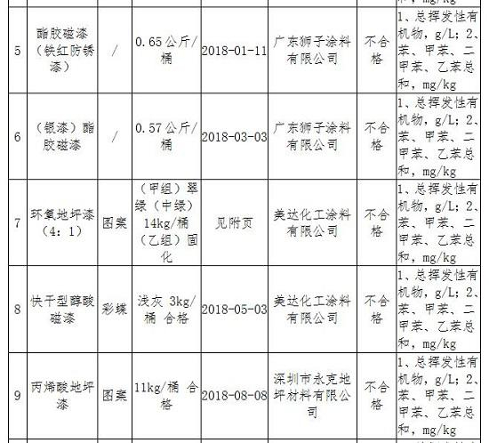 此外,苯、甲苯、乙苯和二甲苯总和项目有10批次产品不合格,涉及样品有美达化工涂料有限公司生产的优保士醇酸改性调合漆、中华制漆(新丰)有限公司生产的长颈鹿牌易俪佳硝基木器漆和广东狮子涂料有限公司生产的多类酯胶磁漆等。