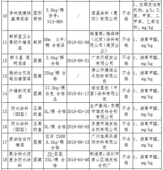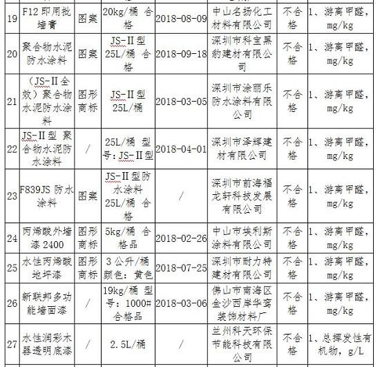 深圳市市场监督管理局2018年建筑装饰装修涂料产品质量监督抽查发现不合格项目产品及企业名单