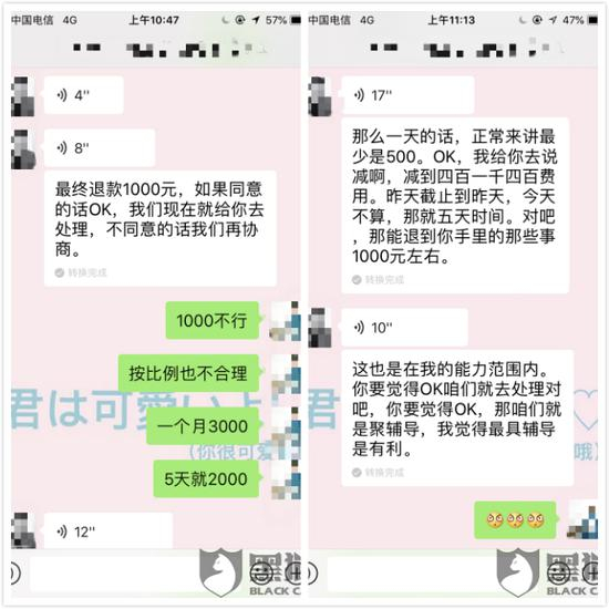 据小涵介绍,她的课程从5月的12号到16号,因为效果不佳,提出退款要求。开始对方提出,只能退一千块钱,但是小涵不同意,后来在平台上进行了投诉。最终经多次协商,对方勉强才退了1300元。