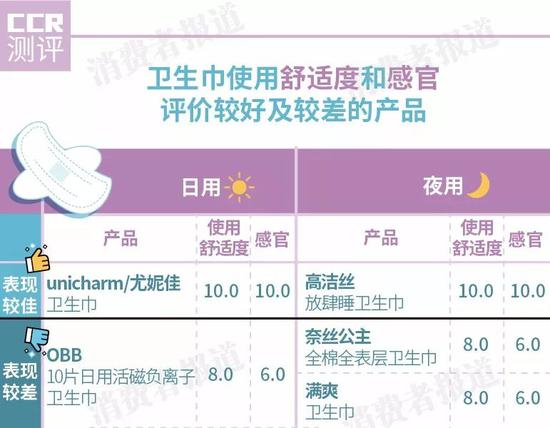 品牌上,夜用款的高洁丝、乐而雅,日用款的尤妮佳无论是使用舒适度还是志愿者主观体验,均取得满分评价;苏菲、安尔乐、美则等品牌亦表现不错。
