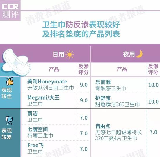 值得一提的是,小仙女们爱用的七度空间、Free飞、苏菲等品牌的几款日、夜用卫生巾吸收性均表现一般,主要是吸水倍率落于人后。