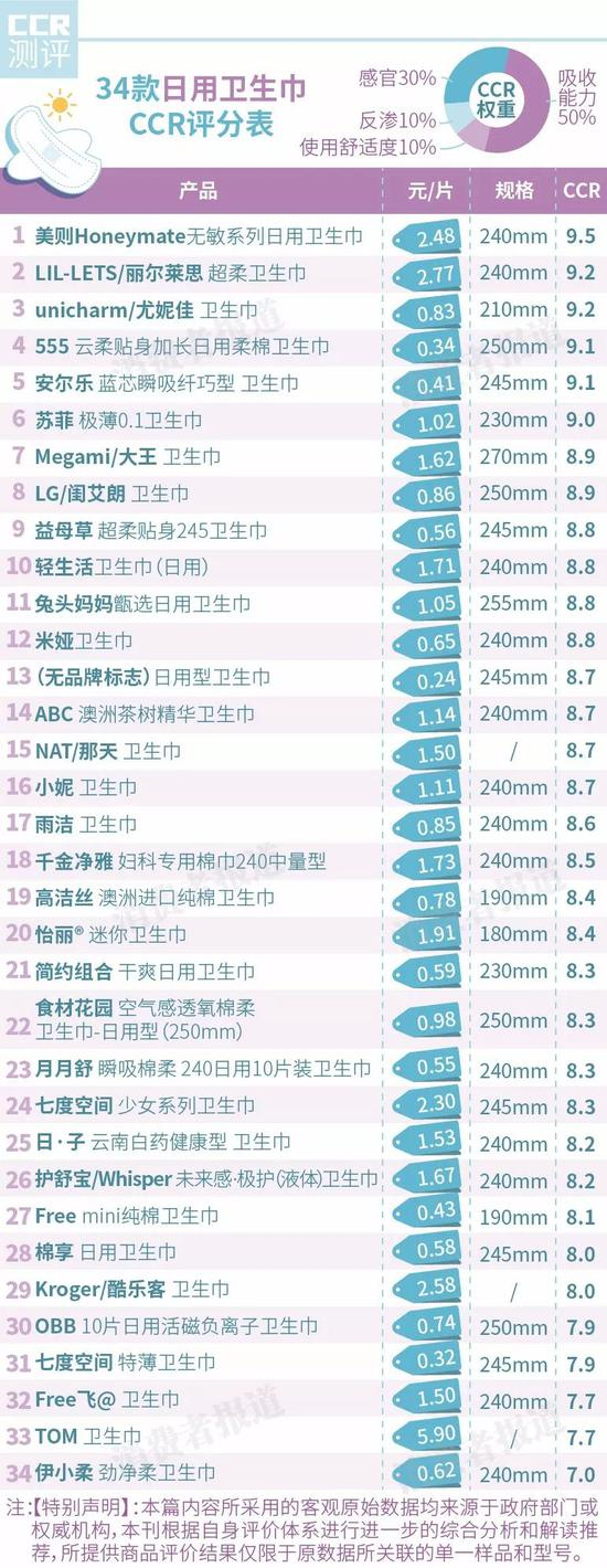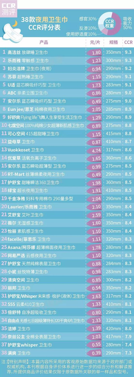 根据CCR评分,日用款表现较好的是美则honeymate、丽尔莱思、尤妮佳等产品;夜用款表现佳的是高洁丝、乐而雅。它们的吸收性能相对不错,且在志愿者盲测中一致取得不错的感官评分,因此值得推荐。