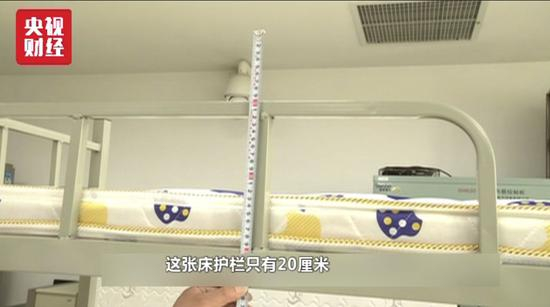 记者随机测量了三所大学宿舍内双层床上铺的护栏高度,结果发现这三张双层床的护栏高度均未达到标准要求的30厘米以上,其中最矮的一个护栏还不到15厘米。