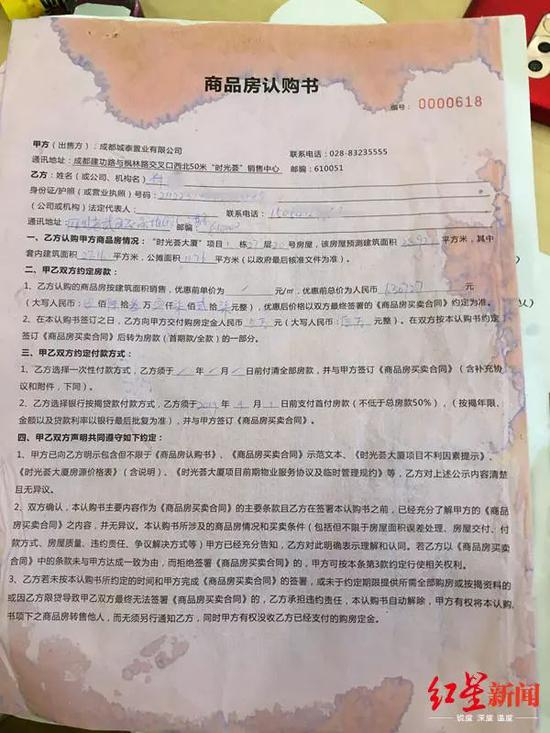 19岁的付小姐,辽宁铁岭人,是一名网络主播,今年准备在成都定居。8月24日,她通过大唐房屋中介在时光荟大厦认购了一套公寓,交了5万元定金。