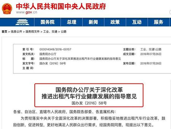2016年7月28日,国务院发布《国务院办公厅关于深化改革推进出租汽车行业健康发展的指导意见》,其中提到“规范发展网约车和私人小客车合乘”。国务院的这份文件将“网约车”和“私人小客车合乘”分开并提,指出前者是经营行为,而后者是分摊出行成本或免费共享的出行方式。