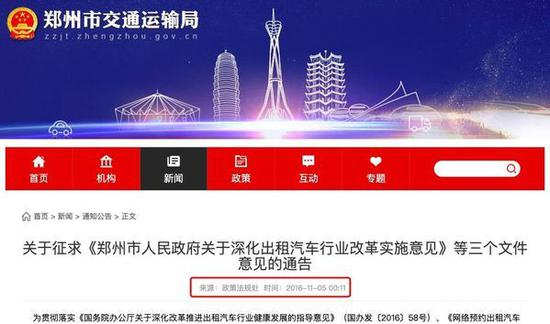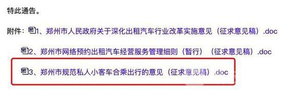 2017年1月,当地媒体集中报道“网约车细则”出台,但同在征求意见稿中的“私人小汽车合乘意见”再未提及 图源/郑州交通局官网截图