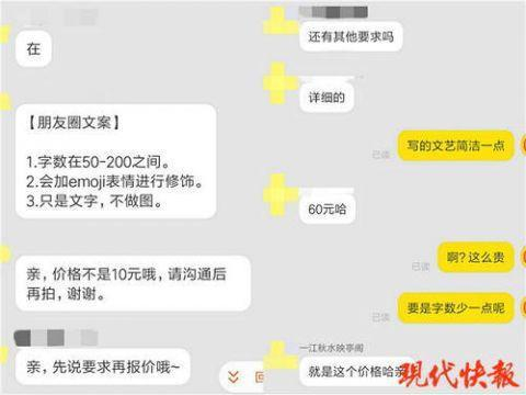 记者咨询一条表白朋友圈的配文,客服报价60元在一家代写服务月销量为679件的网店里,客服告诉记者,如果需要代写朋友圈文案,要先提供具体要求,不同要求价格不一样,不满意可修改,但不能退款。记者随后称需要一个简洁文艺的朋友圈表白配文,客服随即报价60元。当记者询问字数少一些能否便宜,客服表示不行,多少字都一个价。