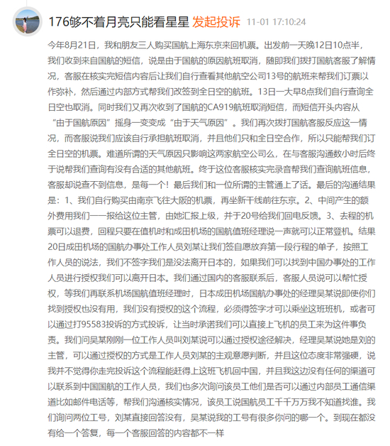 网友@176够不着月亮只能看星星 称,购买国航去返程机票后,自己在出发前一天晚被告知航班取消,并且国航给出的原因前后不一,由“国航原因”变为了“天气原因”,自己拨打客服电话被告知“应该自行承担航班取消”。该网友称联系上了国航的一位“所谓的主管”,在产生纠纷后,该网友欲走投诉流程,国航工作人员表示“没有工号”“工号有很多问的哪一个?”并且一位经理对其表示,“并不觉得(该网友)走完投诉这个流程能赶得上这班飞机回国”。