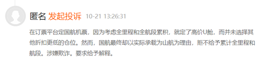 有匿名网友称,因为考虑全里程和全航段累积,选择预订了高价U舱,但国航最终却以实际承载为山航为由,拒不给予累计全里程和航段。