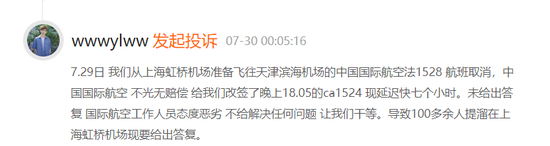 同样,网友@wwwylww 对国航的态度也不能接受,他表示,自己预订的国航航班取消后不仅未获赔偿,而且被改签了延迟7小时的航班,“让我们干等”,工作人员态度恶劣导致未解决任何问题,现场100余人要求给出答复。