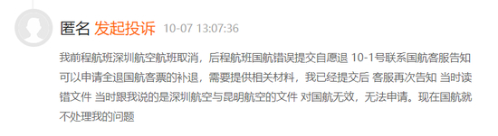 还有匿名消费者表示,自己在退票过程中遭遇客服“读错文件”,按流程提交相关材料后,被客服告知此前系“错读为深圳航空与昆明航空的文件”,无法申请退票。