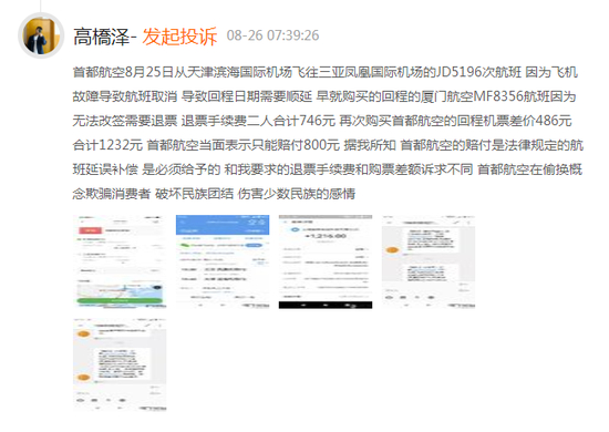 微博用户@高橋泽- 表示,首都航空8月25日从天津飞往三亚的JD5196次航班因飞机故障致航班取消,以至于自己回程机票无法改签需要退票。二人退票手续费合计746元, 再次购买首都航空的回程机票差价486元,共产生1232元差额。首都航空当面表示“只能赔付800元”。