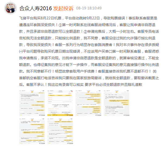 微博用户@合众人寿2016 在黑猫投诉称,自己在飞猪平台购买8月22日机票,却被平台自动跳转9月22日,导致购票错误。而事后联系客服,该消费者感觉遭遇“连环套路深受损失”。他表示,第一时间联系在线客服说明情况后,“客服让我申请非自愿退款,并且承诺非自愿退款可以全额退款!申请完售后,大概一小时左右。客服专员电话告知我无法全额退款,只能按比例退款,我不同意,客服没经过我的允许强行按比例退款,导致我深受损失!”