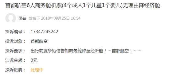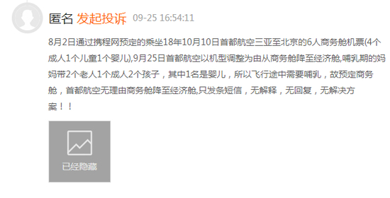 有网友在黑猫投诉平台上投诉称,今年8月2日,其预定首都航空从三亚至北京的航班被迫降舱,订单中6人商务舱机票被告知因机型调整降至经济舱,因同行人中哺乳期的妈妈、2个老人、2个孩子(其中1名婴儿),飞行途中需要哺乳。该消费者表示,首都航空对于降舱,只发了1条短信通知,“无解释,无回复,无解决方案!! ”