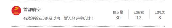截至目前,在此次评选联合主办方黑猫投诉平台上,首都航空投诉量为30件,已回复12件,完成量为8件。
