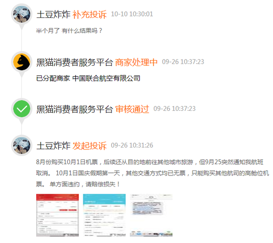 @土豆炸炸 表示,在黑猫投诉后,其收到了联航方面答复——“可以退款或者换成以后相同航程的机票。”但他认为,中国联航单方面违约为其国庆期间出行造成了很多困扰,严重影响后续旅游行程,改换头等舱被迫多花钱,期待中国联航对此事能够给出解决方案。