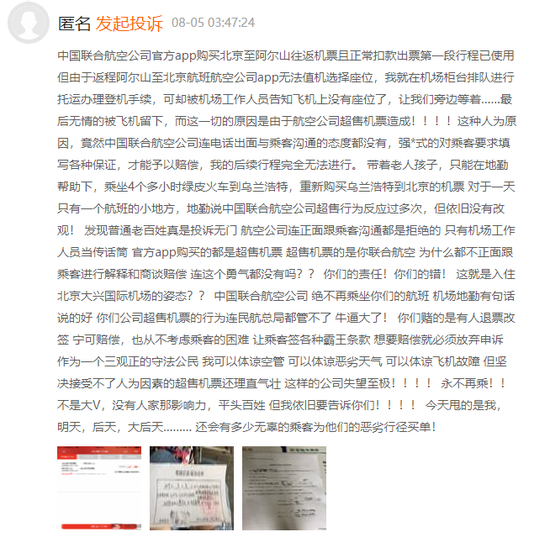有消费者投诉称,自己在阿尔山机场办理登机手续时,被中国联合航空工作人员告知飞机上已无空余座位,被要求在一旁等待,而后“无情地被飞机留下”,最终带着老人和孩子坐4小时绿皮火车到其他机场转乘其他航班。该消费者质疑,“这一切的原因是由于航空公司超售机票造成!”据其描述,该机场地勤人员表示,曾多次反映过中国联合航空公司超售行为,但依旧没有改观。
