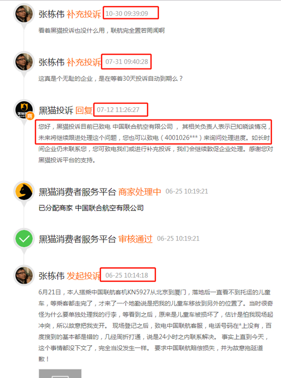 微博认证知名市场营销专家、众筹网合伙人@张栋伟 在黑猫投诉上发起投诉,称在搭乘6月21日从北京到厦门的中国联航KN5927航班过程中,自己托运的儿童车被损坏,几经周折联系上客服后获得“24小时之内联系解决”的回复。黑猫投诉平台介入后,中国联航表示已知晓该事,将跟进处理。但直到10月30日,已过去4个多月,该消费者表示仍未获得回复。