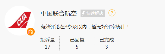 截至目前,在此次评选联合主办方黑猫投诉平台上,中国联合航空投诉量为17件,已回复5件,已完成3件。