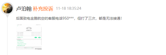 此外,消费者(微博用户@卢泊翰 )11月18日投诉称,金鹏航空无故取消航班导致自己被迫购买高价机票,要求航司补偿购票差价。