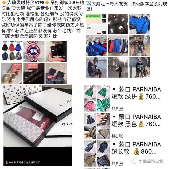 好友添加成功后,记者看到该微信名为“发烧复刻 巫教授XII”的卖家,在朋友圈不仅售卖“加拿大鹅”,各种所谓的“奢侈品牌”应有尽有。但在介绍中,商家把“香奈儿”称为“香奶奶”,“Moncler”称为“M家”,“GUCCI”称为“G家哭泣”。