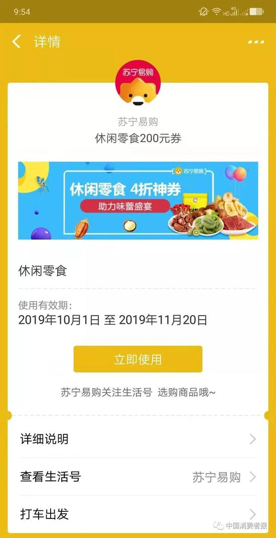 事情的起因要回到3天前。11月20日早上,林宛在翻看支付宝卡包的过程中发现了一张“苏宁易购休闲零食200元券”。