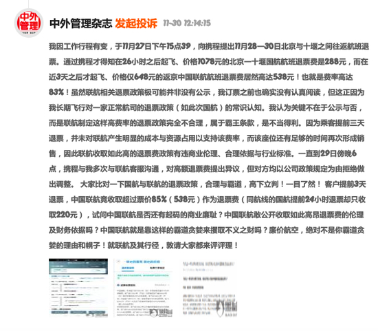 新浪财经讯 11月30日消息,署名为“中外管理杂志”的消费者在黑猫投诉上三问中国联航,“试问中国联航是否还有起码的商业廉耻?中国联航敢公开收取高昂退票费的伦理及财务依据吗?中国联航就是靠这样的霸道贪婪来攫取不义之财吗?”作为消费者,他呼吁有关部门和网友关注航空公司高价退票费,“廉价航空,绝对不是你霸道贪婪的理由和幌子!就联航及其行径,敦请大家都来评评理!”