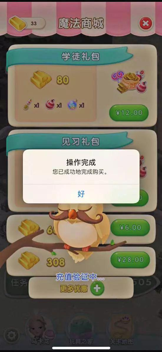 12月9日,记者以上述“已认证”的身份登录《宾果消消消》并进入其商城页面,发现其为玩家提供多个不同价位的充值礼包,记者尝试购买其“12元”的礼包后,系统转入支付页面,随后显示充值成功。