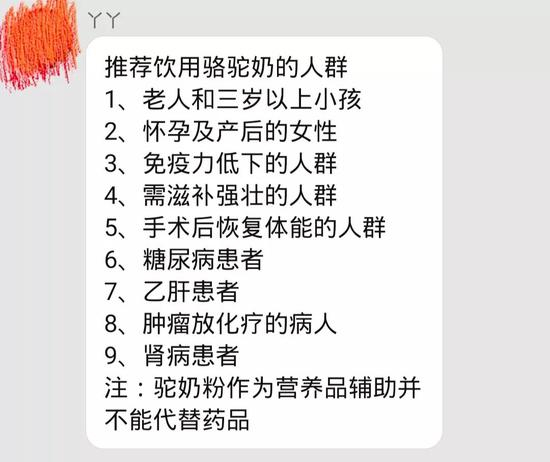 虽然商家写着“驼奶粉作为营养品辅助并不能代替药品”,但喊出糖尿病、乙肝、肾病等慢性病人皆适用的口号,让人不得不想到商家是不是把“营养品”当成“药品”来卖?