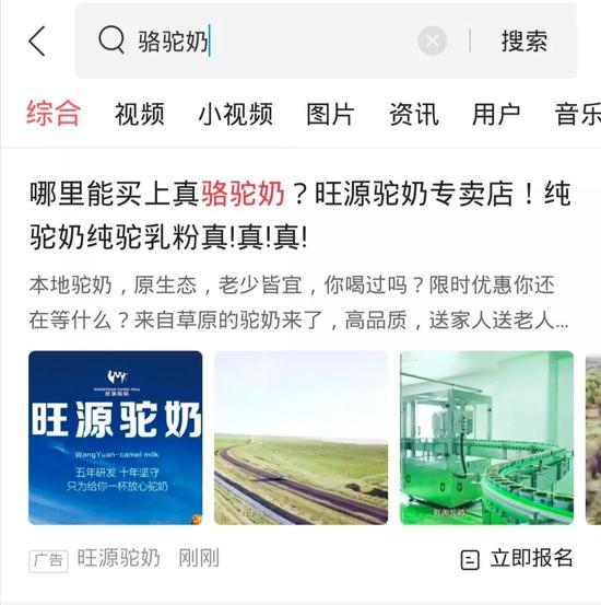 从百度搜索指数可以很明显的看到,骆驼奶从2019年下半年开始搜索量暴增,百度app、今日头条等信息流广告也有其身影。