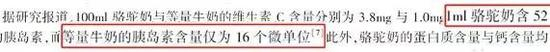 还有维生素C,商家标语写到“骆驼奶中维生素C含量是牛奶的3.8倍,是人奶的1.5倍”。但这也只是商家给消费者带来骆驼奶比牛奶营养更丰富的印象,因为人体补充维生素C并不主要靠牛奶,要知道菠菜的维C含量是牛奶的32倍,冬枣的维C含量是牛奶的243倍!