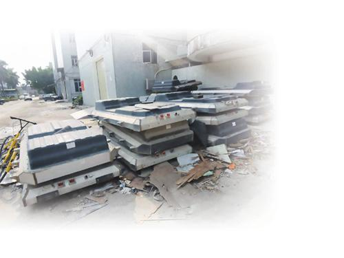 记者与张明随后来到东莞市西边的另一个工业园区。这是一个全开放式的园区,距离园区很远就能看到动力电池包的外壳散落在路边与墙角,这些外壳既有乘用车的,也有客车的。这里的厂房数量相比上述记者走访的另一个调查点还要多,回收电池规模也更大,且不同于之前的调查点,这里全部都是车用动力电池。