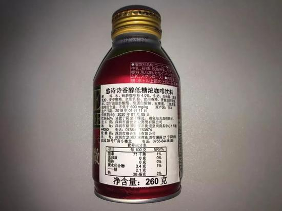 不过,一款由日本进口的悠诗诗香醇低糖浓咖啡饮料标示咖啡因含量不低于600mg/kg,实际咖啡因的检出值为535mg/kg,与其宣称值不符,值得消费者注意。