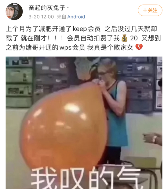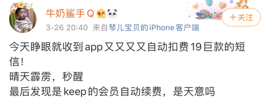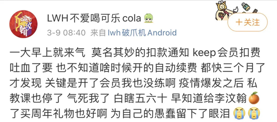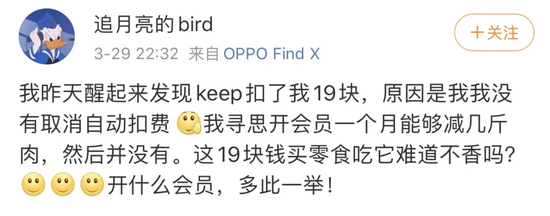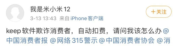 记者了解到,不少消费者通过微博等社交平台反映keep自动扣费的问题。