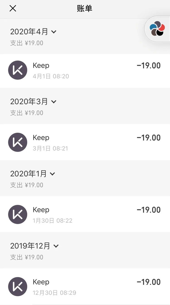 记者在杨欢提供的扣费截图上看到,2019年12月-2020年4月,keep已经多次续扣除了每月19元的会员费用。
