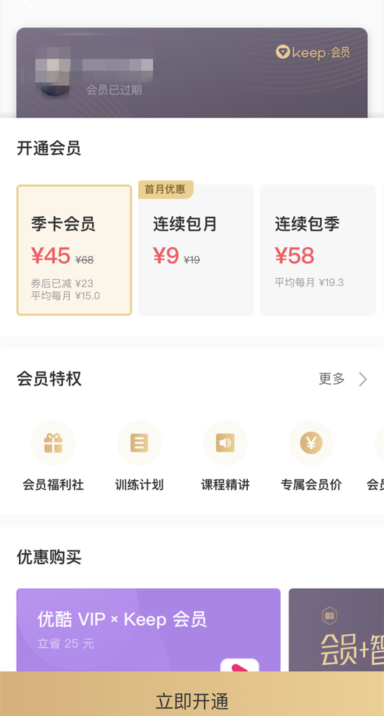 更让杨欢觉得蹊跷的是,期间,keep软件的app端一直显示她不是keep会员,页面下端还有“立即开通”会员服务的提示,在账号和头像位置下端,显示“会员已过期”。